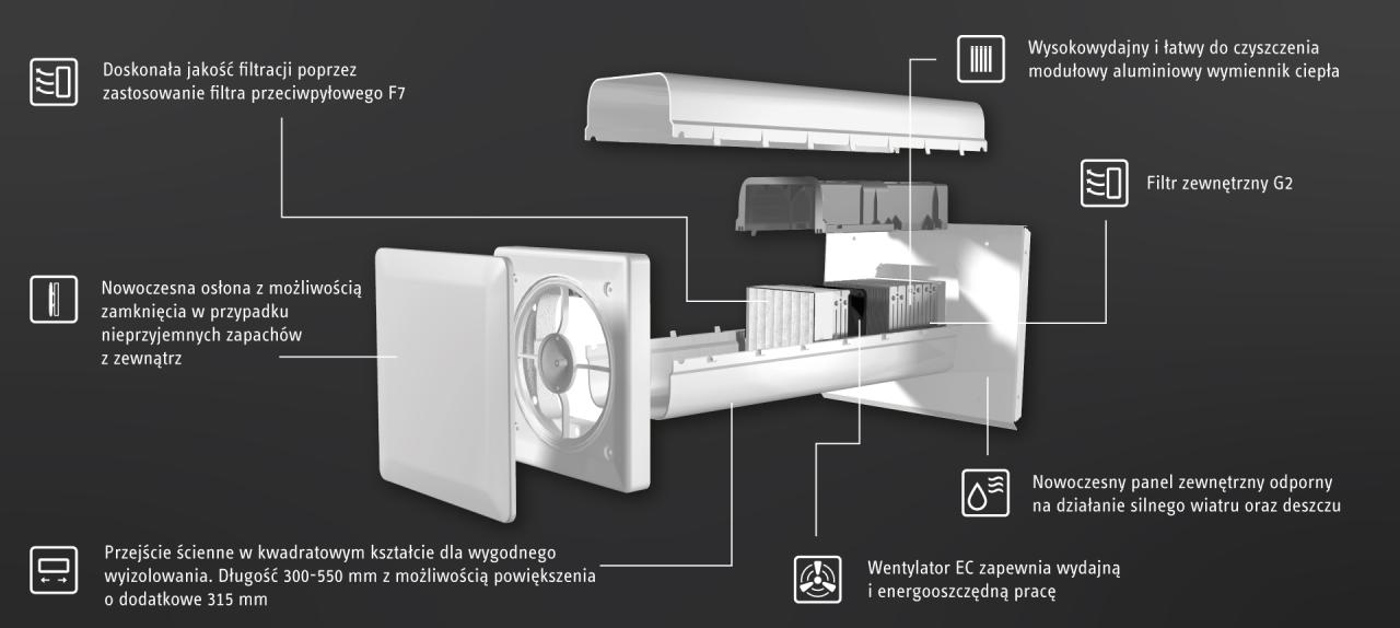 Decentralny system wentylacji składa się z centralnego sterownika, który zarządza pracą maksymalnie 8 rekuperatorów zamontowanych w ścianach zewnętrznych pomieszczeń, takich jak pokoje, sypialnie, jadalnie, salony, gabinety czy pralnie. Proces wentylacji jest bardzo wydajny dzięki naprzemiennej pracy urządzeń, co pozwala na uniknięcie zamarznięcia wymiennika ciepła i nie wymaga użycia grzałki elektrycznej. Urządzenia STIEBEL ELTRON charakteryzują się wysoką sprawnością oraz higieną dzięki zastosowaniu modułowego, aluminiowego wymiennika ciepła oraz systemu podwójnej filtracji powietrza.
